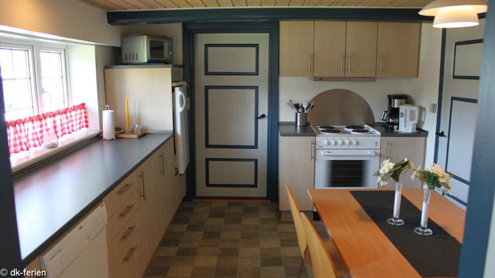 Køkken: komfur, emhætte, køleskab med frostboks, mikrobølgeovn, kaffemaskine, elkedel, opvaskemaskine